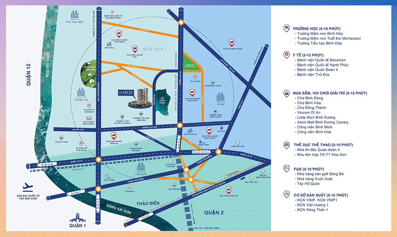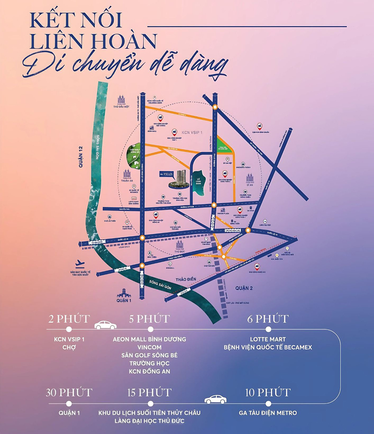 Ngoài ra, The Felix Thuận An cũng được kết nối thuận tiện với trung tâm hành chính Thành phố Thuận An, Trung tâm tài chính Thủ Dầu Một, Trung tâm Hành chính Thành phố Dĩ An, KCN VSIP 1, VINCOM Dĩ An, Bệnh viện quốc tế Becamex, Bệnh viện quốc tế Hoàn Mỹ Sài Gòn Thủ Đức, Làng Đại học Quốc Gia Thủ Đức, ....