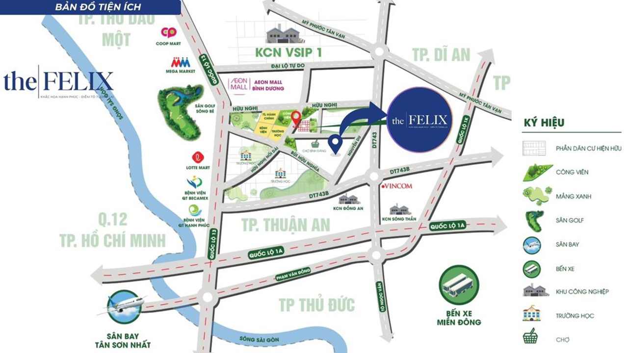 Khu vực của Dự án The Felix Thuận An kề cận Khu công nghiệp VSIP1, nơi tọa lạc trụ sở, nhà máy, khu công nghiệp của nhiều của nhiều thương hiệu đến từ Singapore, Hàn Quốc, Đức,… Khu vực này có lợi thế dễ kết nối trung tâm hành chính thành phố Thủ Dầu Một, Dĩ An, di chuyển dàng đến trung tâm TP. HCM như: Quận 12, Quận Gò Vấp, sân bay Tân Sơn Nhất, ....