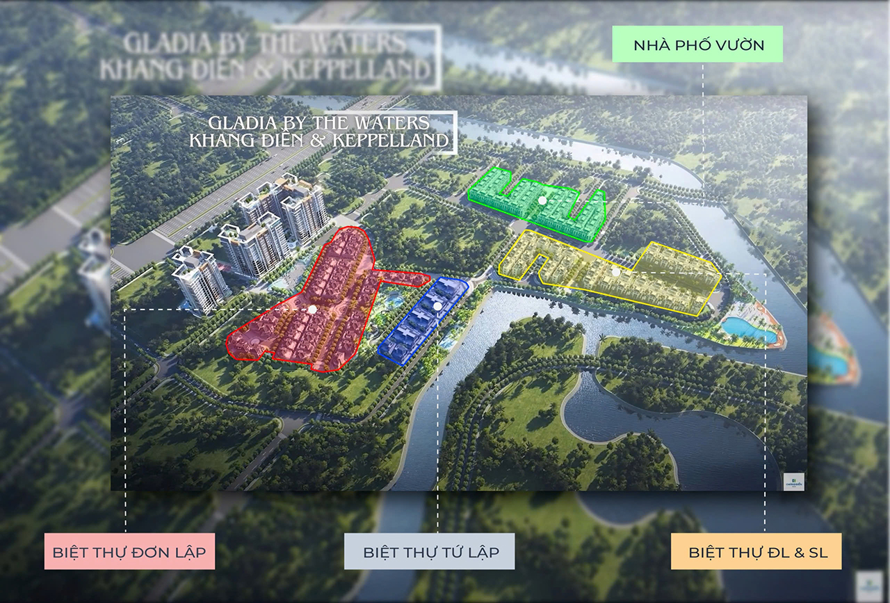 Với tổng quy mô 11.8 hecta, giai đoạn hiện tại của dự án Gladia By The Waters tập trung vào phân khu nhà ở thấp tầng với chỉ 216 căn, bao gồm các loại hình sản phẩm đa dạng để đáp ứng nhu cầu của giới tinh hoa.