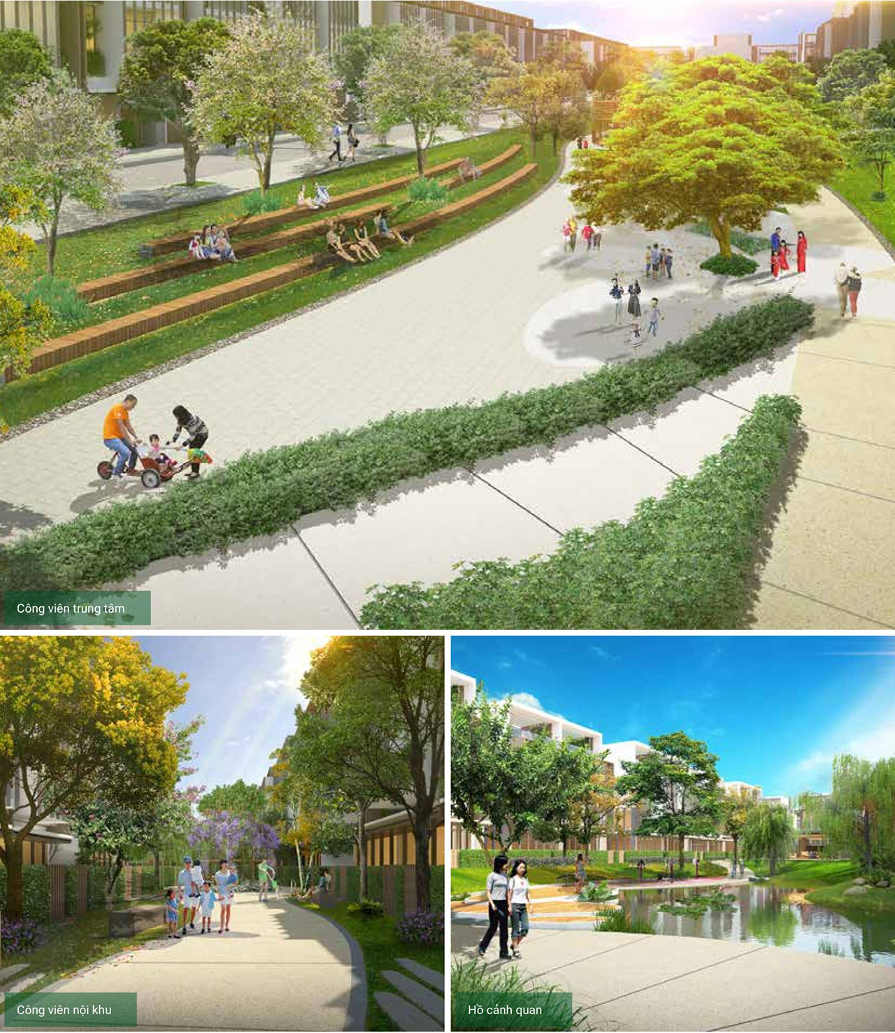 Những khu vườn chung được thiết kế tinh tế ngay phía sau, mang mảng xanh đến tận cửa từng ngôi nhà, tạo nên một bức tranh thiên nhiên yên bình và một không gian thư giãn lý tưởng cho cả gia đình.